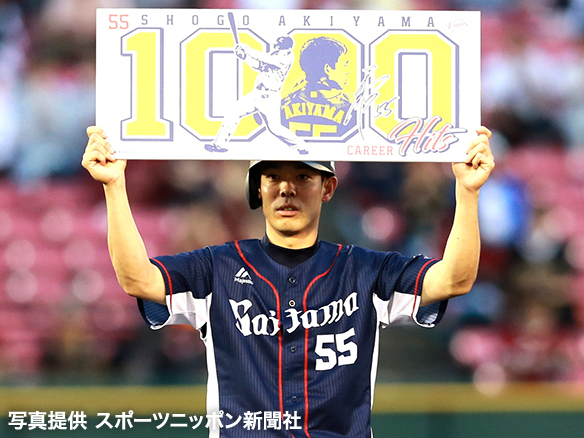 秋山がライトへの二塁打を放ち通算1,000安打を達成する