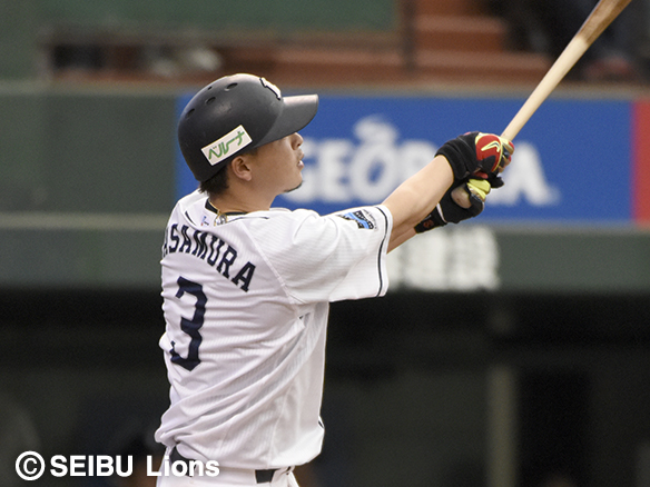 2番 源田 左安 外角低めのフォークをレフトへ打ってヒット 1塁 |