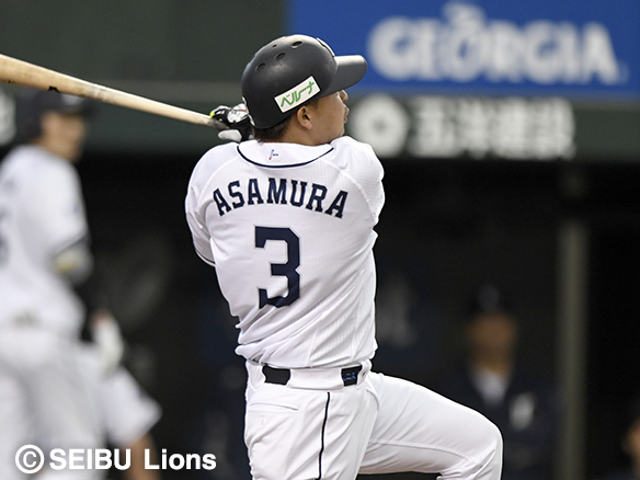 3番 浅村 左安 内角低めのスライダーをレフトへ打ってヒット 1塁 |