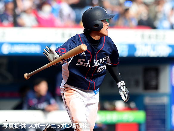 1番 秋山 遊安 外角低めのフォークをショートへ打ってヒット 1塁 |