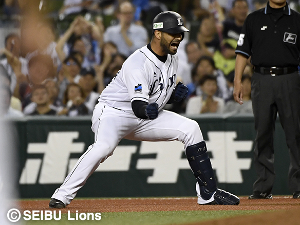 8番 メヒア 中安 満塁 外角低めのストレートをセンターへ同点タイムリーヒット! 西4-4ロ |