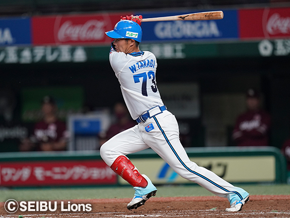 投手 與座 9番 辰己 右本 カウント0-0からライトスタンドへ勝ち越しホームラン! 西1-2楽 ![]() 1