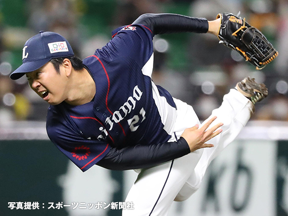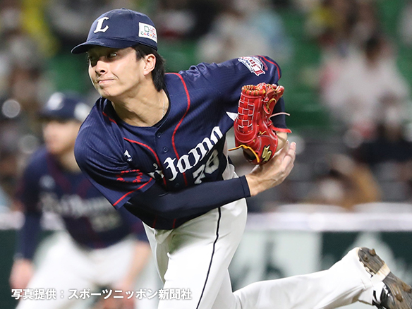 投手 十亀 5番 栗原 空三振 低めのスライダーを空振り三振 1アウト |