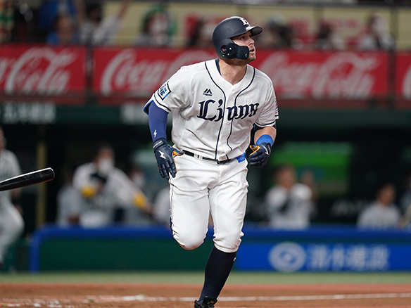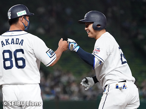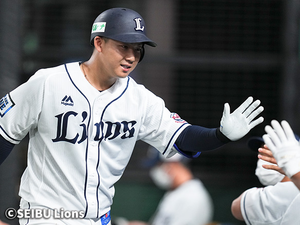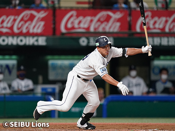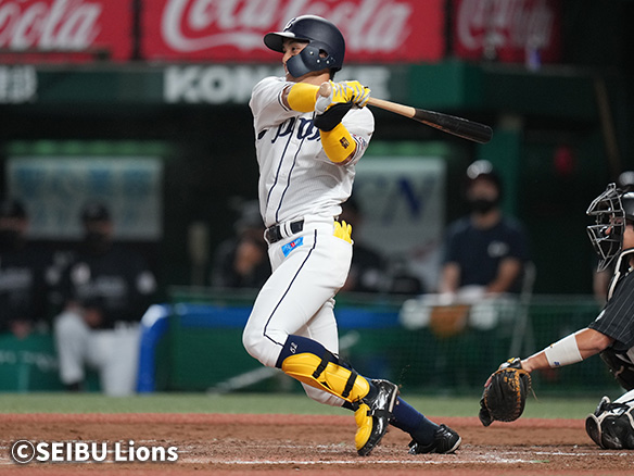 5番 外崎 左安 高めのカットボールをレフトへ打ってヒット 1塁 |