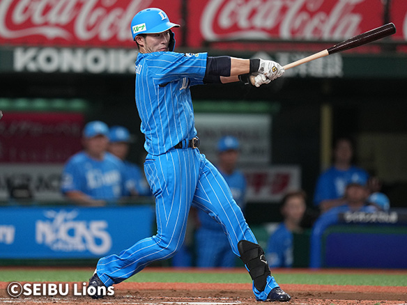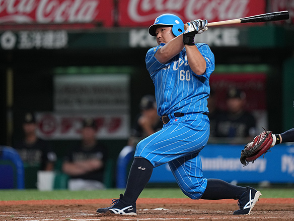 5番 外崎 左安 155キロの内角高めのストレートをレフトへ打ってヒット 1塁 |