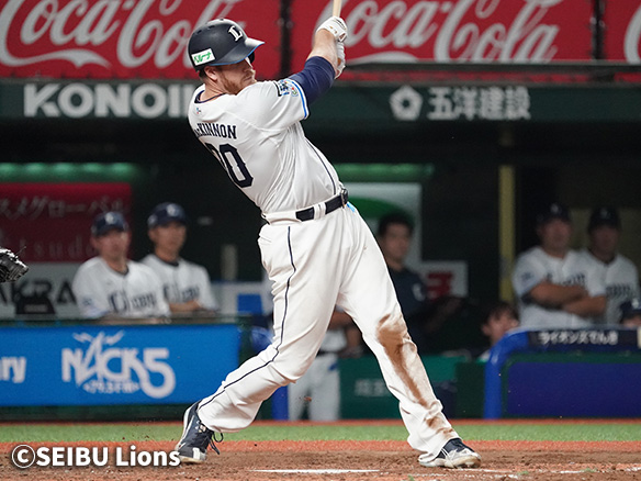 7番 マキノン 左安 ランナー1,3塁 ど真ん中のストレートをレフトへ同点タイムリーヒット! 1,2塁 西1-1楽 ![]() 1