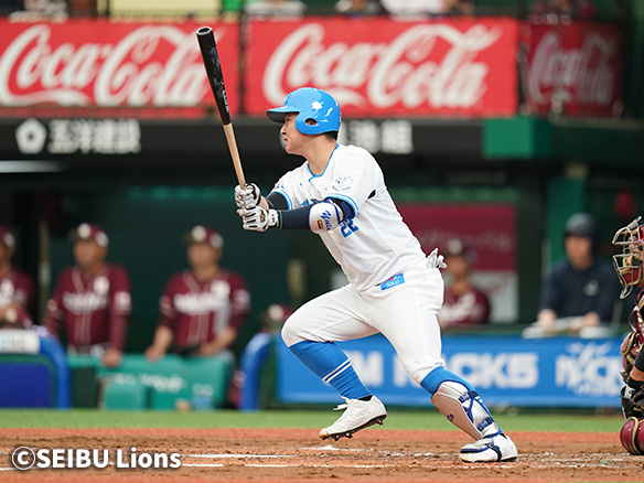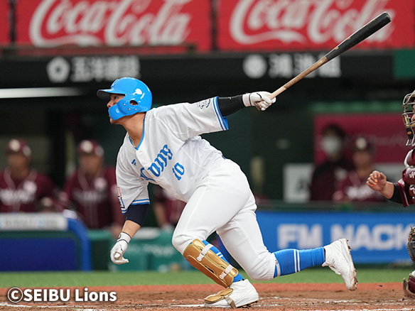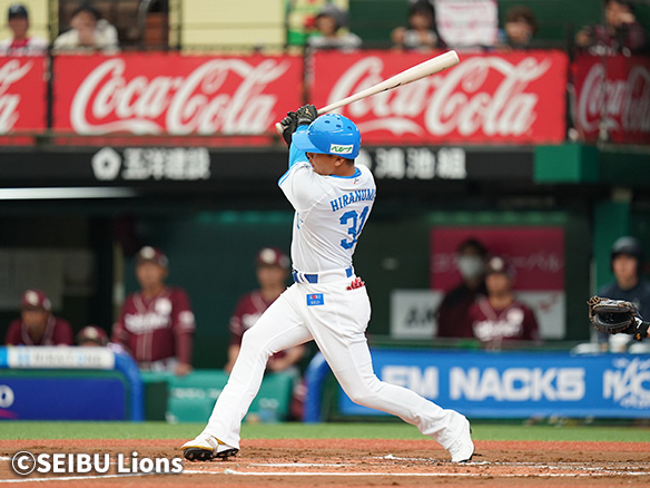 5番 佐藤龍 左安 ランナー2塁 外角低めのカーブをレフトへ同点タイムリーヒット! 1塁 西2-2楽 ![]() 2