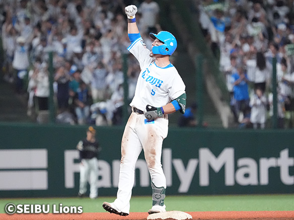 6番 外崎 左2 満塁 152キロの内角高めのストレートをレフトへ勝ち越しタイムリーツーベース! 2,3塁 西5-3ソ ![]() 5