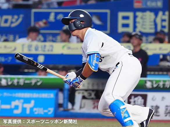 5番 外崎 左安 内角のフォークをレフトへ打ってヒット 1塁 |