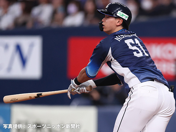 6番 外崎 左安 外角のスライダーをレフトへ打ってヒット 1塁 |