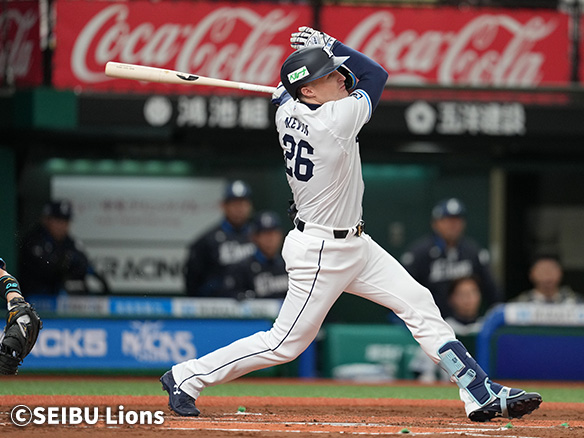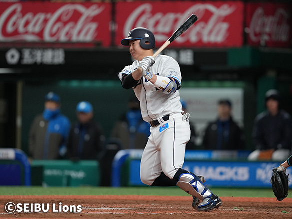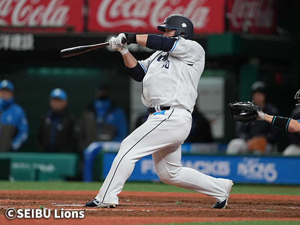 6番 外崎 中安 ランナー1,3塁 内角高めのカットボールをセンターへタイムリーヒット! 1,2塁 西1-2日 ![]() 1