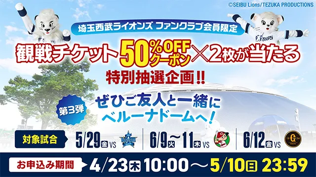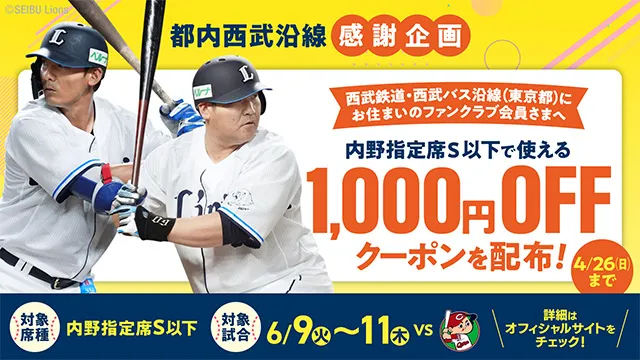 チケット2026/04/07 (火)<東京都内の西武鉄道・西武バス沿線にお住まいのファンクラブ会員さま限定!>6/9(火)~11(木)広島戦で使える割引クーポンを進呈! -