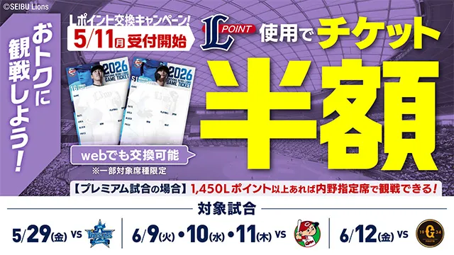 チケット2026/04/08 (水)<4/20(月)販売開始!>5/29(金)・6/9(火)~11(木)の試合は『ライオンズ学割web』でおトクに観戦しよう♪ -