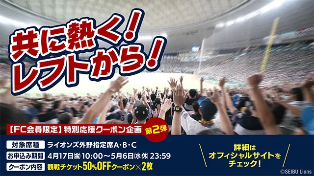 チケット ファンクラブ2026/04/06 (月)<4/17(金)受付開始!>『共に熱く、レフトから!』ライオンズ外野指定席で使える特別応援クーポン企画のお知らせ(FC会員限定) -