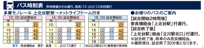 | お問い合わせ | 多摩都市モノレール株式会社TEL:042-526-7800 (平日 9:00~17:45) 埼玉西武ライオンズインフォメーションセンターTEL:0570-01-1950 (平日10:00~18:00) 主催試合開催日(デーゲーム10:00~18:00 / ナイトゲーム10:00~20:00)  |
