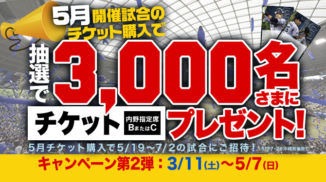 キャンペーン期間中(2017年3月11日(土)〜5月7日(日))に、ライオンズオンラインチケットショップでチケットを購入された方全員が対象となります!