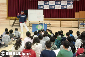 「プロ野球選手」という夢を叶えた経験や体験をもとにライオンズアカデミー平尾博嗣コーチからは、「日々の生活の中から夢中になれることを見つけること」、「全力で取り組むこと」、「簡単に諦めない。逃げ癖をつけないこと」、「何度も立ち向かってチャレンジすること」と、アドバイスが送られました。今後児童たちがそれぞれの道に進む中でのヒントにしてほしいと思います。