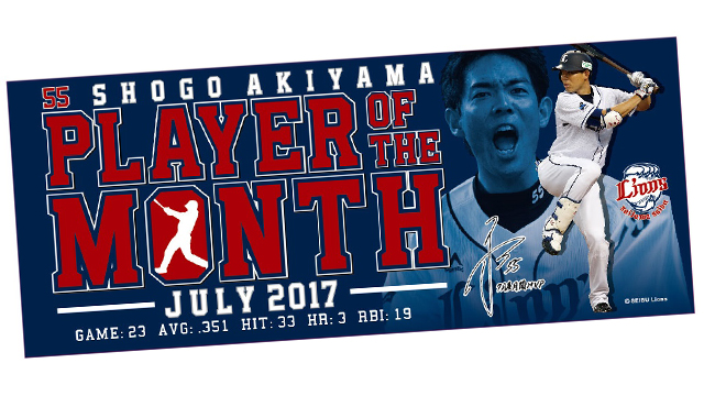 秋山選手は7月度、全23試合に出場し、打率 .351、33安打、3本塁打、19打点の好成績を残しました。