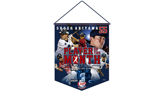 秋山選手の迫力あるバッティングフォームをデザインし、月間MVPを表す"Player of the month"の文字をあしらったフェイスタオル、タペストリー、キーホルダーの3点セットです。