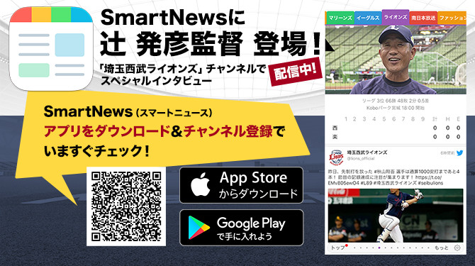 まだ「SmartNews」アプリをダウンロードしていないという方は、さっそくダウンロードして、「埼玉西武ライオンズ」チャンネル内限定コンテンツをチェック! 辻監督をはじめ、選手直筆サイングッズが当たるキャンペーンも実施中ですので、そちらもチェックしてさっそく応募しよう!!