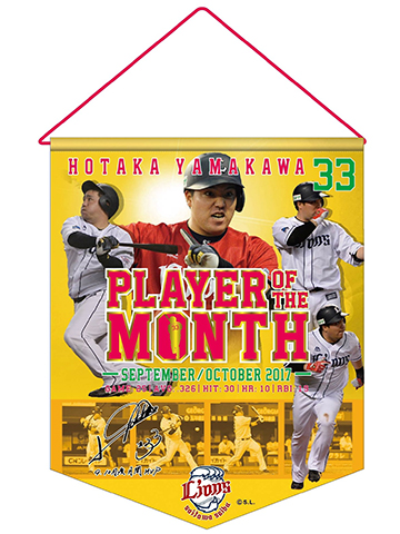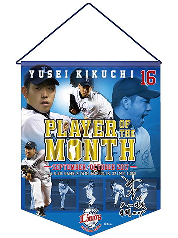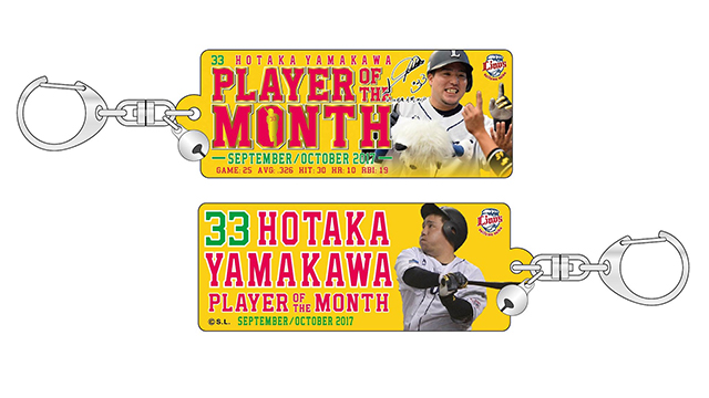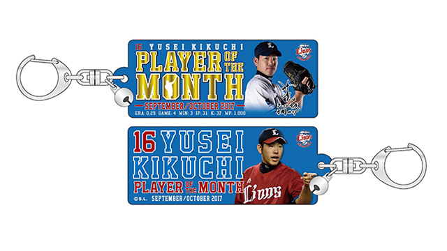 菊池投手の闘志あふれる投球フォームと山川選手の凛々しいバッティングシーンをデザインし、月間MVPを表す"Player of the month"の文字をあしらったフェイスタオル、タペストリー、キーホルダーの3点セットを販売します。