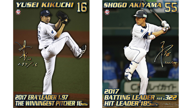 菊池投手と秋山選手のタイトル獲得記念選手カードの2種類を両選手1,000セット限定で販売いたします。
