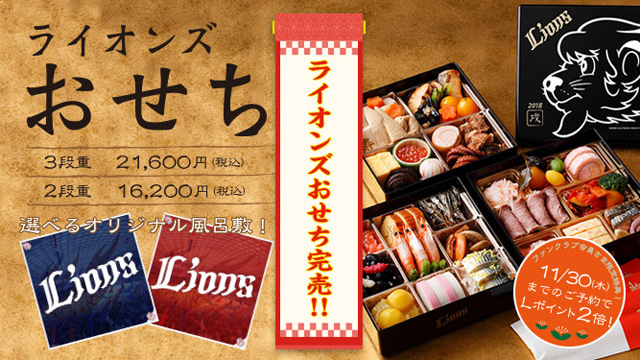 ライオンズストアオンラインにて10月11日(水)より"数量限定"で予約受付をしておりました2018年の「埼玉西武ライオンズオリジナルおせち」が、大好評につき2段重、3段重ともに"完売"いたしました!!