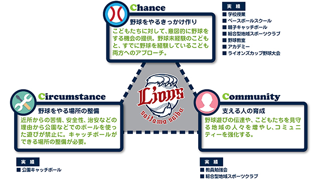 ライオンズの選手たちも野球を始めたきっかけは遊びや地域の活動からスタートしています。現在のこどもたちにはそういった自由に遊べる環境が無くなってきています。もう一度こどもたちが野球を楽しめるように、皆さまにカードを購入していただくことで得られる収益を使用させていただき、こどもたちが野球に触れ合える環境の整備を行っていきます。
