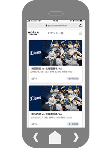 (1)埼玉西武ライオンズ公式のLINE@アカウントのメニュー左下の「Quick Ticket 観戦体験一覧 MOALA」ボタン、もしくは、「MOALA(モアラ)ページ」のQRコードをスマートフォンで読み取ってご利用ください。