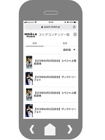 Quick Ticket(スマホチケット)の券面だけではなく、Quick Ticket(スマホチケット)でご来場された方全員に配布しているスペシャル壁紙画像や勝利時にプレゼントのビクトリーフォトも並べて表示することができるため、いつでも簡単にご観戦時の興奮を思い返すことができます!