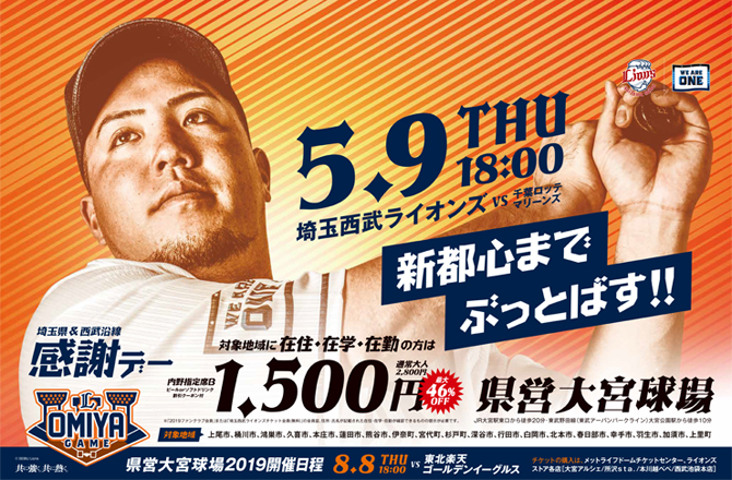 5月9日(火)は今季2度目の県営大宮球場での公式戦を開催します!今回は大宮開催で唯一サードユニフォームを着用して戦います!4月開催試合でもご好評いただいた大人気の大宮限定グッズの販売や、埼玉県のマスコット「コバトン」と「さいたまっち」の来場、ファンクラブ会員限定イベントなど盛りだくさん!
