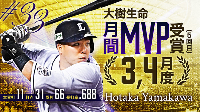 山川選手は3、4月度、チームの全25試合に先発出場し、本塁打、打点、塁打(66)、長打率(.688)の4部門でリーグトップの成績を残しました。