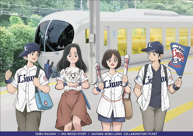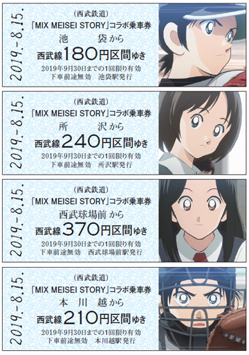 また、コラボデーの開催を記念して、西武球場前駅を含む西武鉄道沿線4駅にて、「コラボ記念乗車券」を発売いたします。「MIX」メインキャラクターをデザインしたオリジナル台紙と硬券乗車券(4枚)がセットになっていますので、来場の記念にぜひお買い求めください。