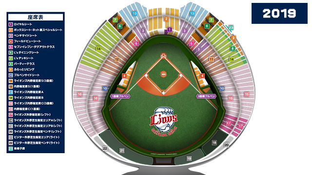 2019シーズンのベンチサイドシート(3塁側の一部)、内野指定席S、内野指定席B、内野指定席Cにあたるエリアのシートについて、2020年は内野指定席SS、内野指定席A、内野指定席B、内野指定席Cと席種名称を新たにし、さらに高品質なクッションシートにリニューアルいたします。通路側のシートには、現在のシートと同様に「レオマーク」があり、歴史を受け継いでおります。