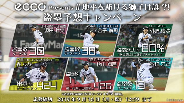 9月14日(土)・15日(日)・16日(月・祝)対千葉ロッテマリーンズ戦(13:00試合開始)を対象に「ECCO(エコー) presents #地平を駈ける獅子は誰?! 盗塁予想キャンペーン」を実施いたします。