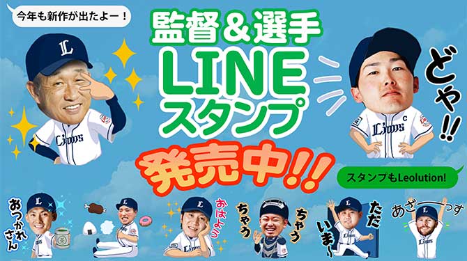 辻監督のお茶目なリアクションや新キャプテン源田壮亮選手のどや顔、14年振りにライオンズに復帰した松坂大輔投手の「ただいま」など、野球トークにも日常トークにも使っていただける全32種のスタンプとなっています。