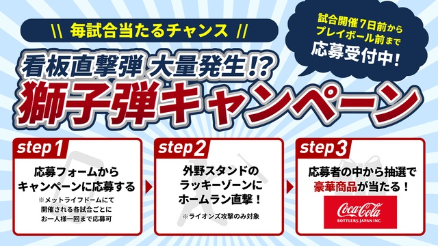 埼玉西武ライオンズ攻撃時のホームランボールが「コカ・コーラ ラッキーゾーン」に直撃すると、ご応募いただいた方の中から抽選で「ホームランボールが直撃した回数×5名さま」に豪華賞品が当たります!ホームランボールの行方に目が離せませんね!9月のホームゲームは12試合、全ての試合に応募して豪華賞品をゲットしよう!