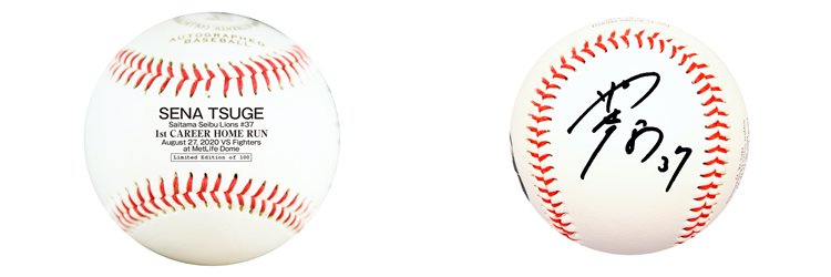 「プロ初本塁打記念直筆サイン入りフォト」は、プロ初本塁打記念試合となった8月27日のプレーシーンの写真をコラージュデザインしたフォトに、直筆サインが入っています。「プロ初本塁打記念直筆サイン入りボール」は、初本塁打の日付が刻印されたオリジナルのボールに、直筆サインが入った商品です。