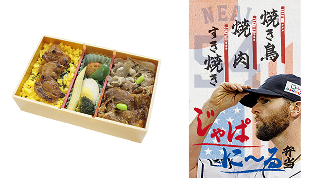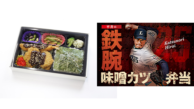 | 弁当種類 | ・ニール投手プロデュース弁当「じゃぱに~る弁当」1,500円 ・平井投手プロデュース弁当「平井の鉄腕味噌カツ弁当」1,400円 ・栗山選手プロデュース弁当「巧御膳」1,400円 ・山川選手プロデュース弁当「山川のちゅんじゅくステーキ弁当」1,500円 ・源田選手プロデュース弁当「源田の#箸とまらん弁当」1,400円 ・金子選手プロデュース弁当「ねこの洋食弁当」1,400円 ・森選手プロデュース弁当「友哉の牛肉めし」1,400円 ・内海投手プロデュース弁当「内海のダブルチキン弁当」1,400円 ・中村選手プロデュース弁当「剛也の串カツ弁当」1,400円 ※価格は全て税込価格 |