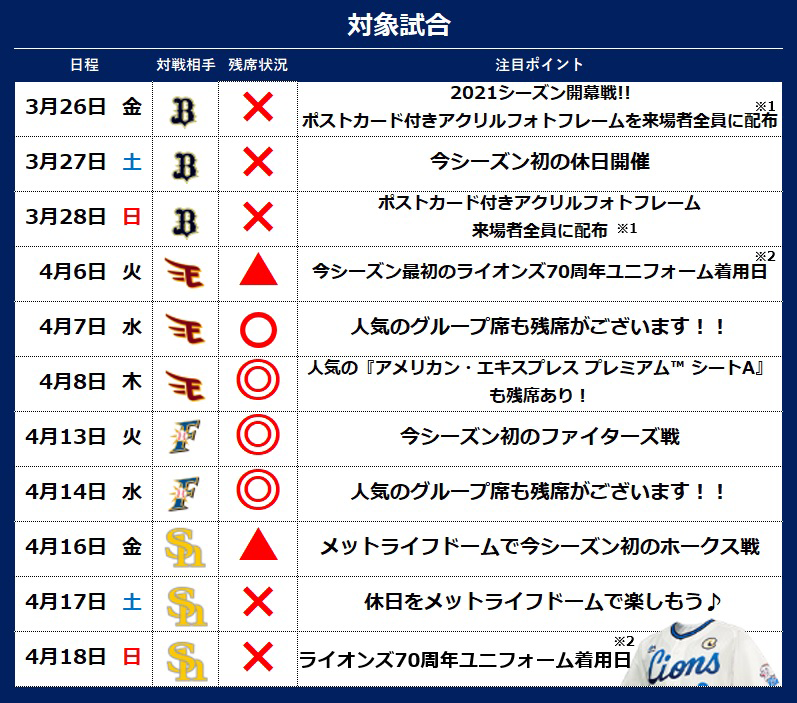 販売場所はライオンズオンラインチケットショップ、メットライフドームチケットセンター、ライオンズストア各店(フラッグスを除く)、セブンチケット(Web)のみとなります。その他の場所では残席がある場合も販売いたしません。