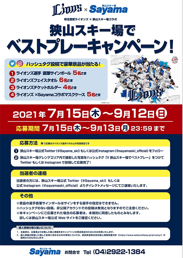 選手とのコラボ写真を撮影し、Twitter、Instagramに「#狭山スキー場でベストプレー」を付けて投稿いただいた方から抽選で選手の直筆サイン入りグッズがあたるキャンペーンも行っていますので、ぜひご来場の際には撮影をしてみてください!
