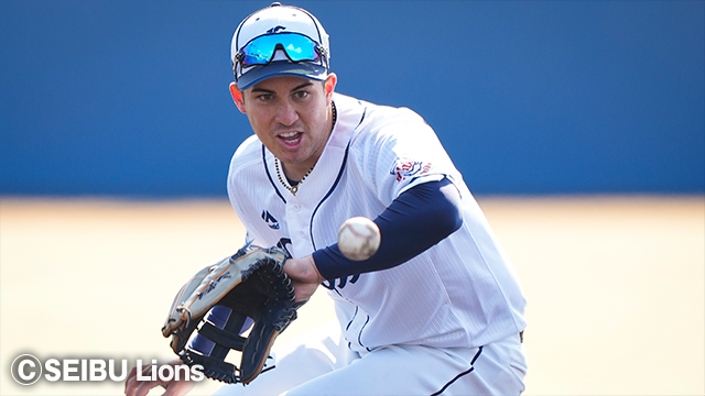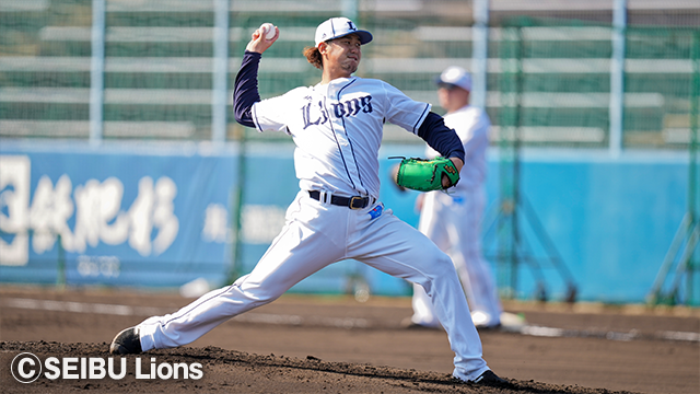 打廻り、シートノックを終え、シート打撃。まずは與座投手がマウンドへ。最初のバッターはルーキーの古賀選手。古賀選手の打球は早速守備に入っている外崎選手が捕球しセカンドフライとなります。與座投手はテンポよく、きわどいコースへ投げ込みます。「與座いいね~!」という声も飛びました。