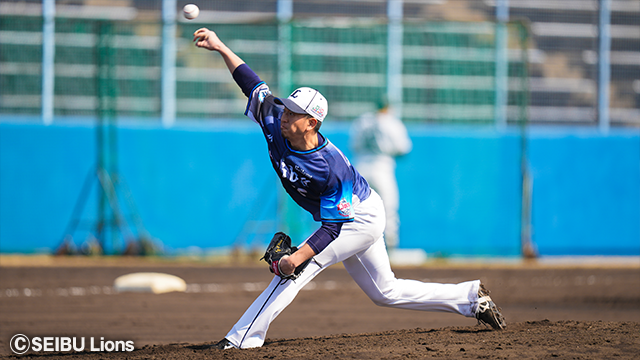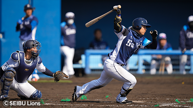 紅白戦の先頭打者となった紅組の1番・鈴木将平選手が1、2塁間を破る安打で元気よく出塁します。この鈴木選手の安打から紅組はチャンスを作りますが、先発の渡邉投手が山川穂高選手を内野ゴロ、中村剛也選手から見逃し三振を奪い無失点で切り抜けます!