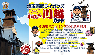 川越エリアの観光名所や名産品と埼玉西武ライオンズの選手がコラボされたデザインのガチャの販売がスタート。