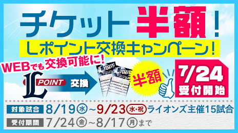 8月19日(水)~9月23日(水・祝)のライオンズ主催合計15試合を対象に「チケット半額!Lポイント交換キャンペーン!」を実施します!