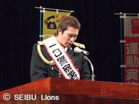 「これから年末年始にかけて忙しい時期ですが、車に乗るときは周りに十分注意してください。一人一人が気をつけていくことで、事故も減っていきますので、ご協力をお願いいたします。また元気な姿で、西武ドームでお会いしましょう!」