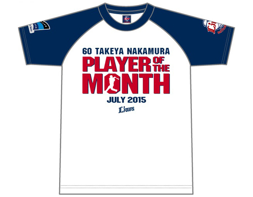 月間MVPをあらわす「Player of the month」の文字の中に中村選手のバッティングフォームをあしらい、中村選手のガッツポーズの写真が入ったデザインのラグランTシャツとフラッグです。