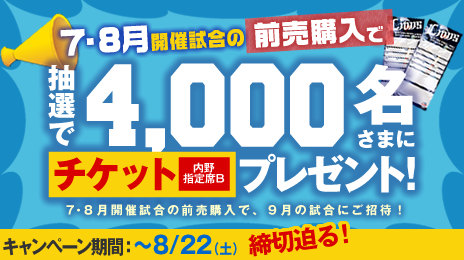 8月23日(日)までのライオンズ主催試合のチケットを前売購入された方に、観戦招待券が当たる、「4,000名さまにチケットが当たる!チケット前売購入キャンペーン!」。