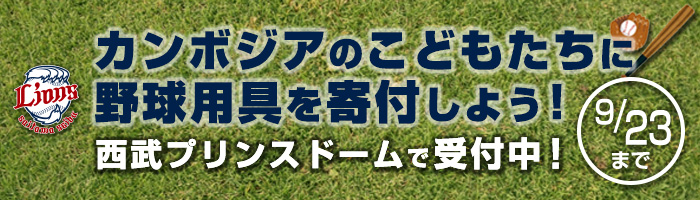西武プリンスドームでの試合開催日に実施しているカンボジアのこどもたちへの野球用具寄付プロジェクトですが、用具の受付期間を9月23日(水・祝)まで延長して実施することとなりました!