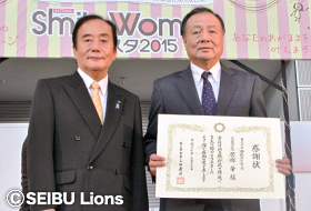 9月12日(土)・13日(日)にさいたまスーパーアリーナで開催された「SAITAMA Smile woman フェスタ2015」において、埼玉県が推進する「埼玉版ウーマノミクスプロジェクト」と「介護職員しっかり応援プロジェクト」を支援しているライオンズの取組みに対して、埼玉県上田清司知事より感謝状が贈呈されました。